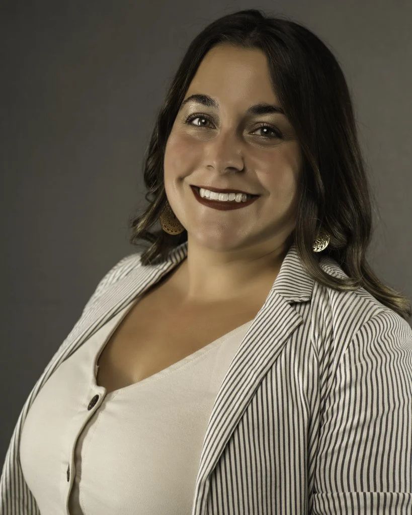 A woman with shoulder-length dark brown hair smiling, wearing a white top and a light-colored striped blazer with large earrings, against a neutral background.