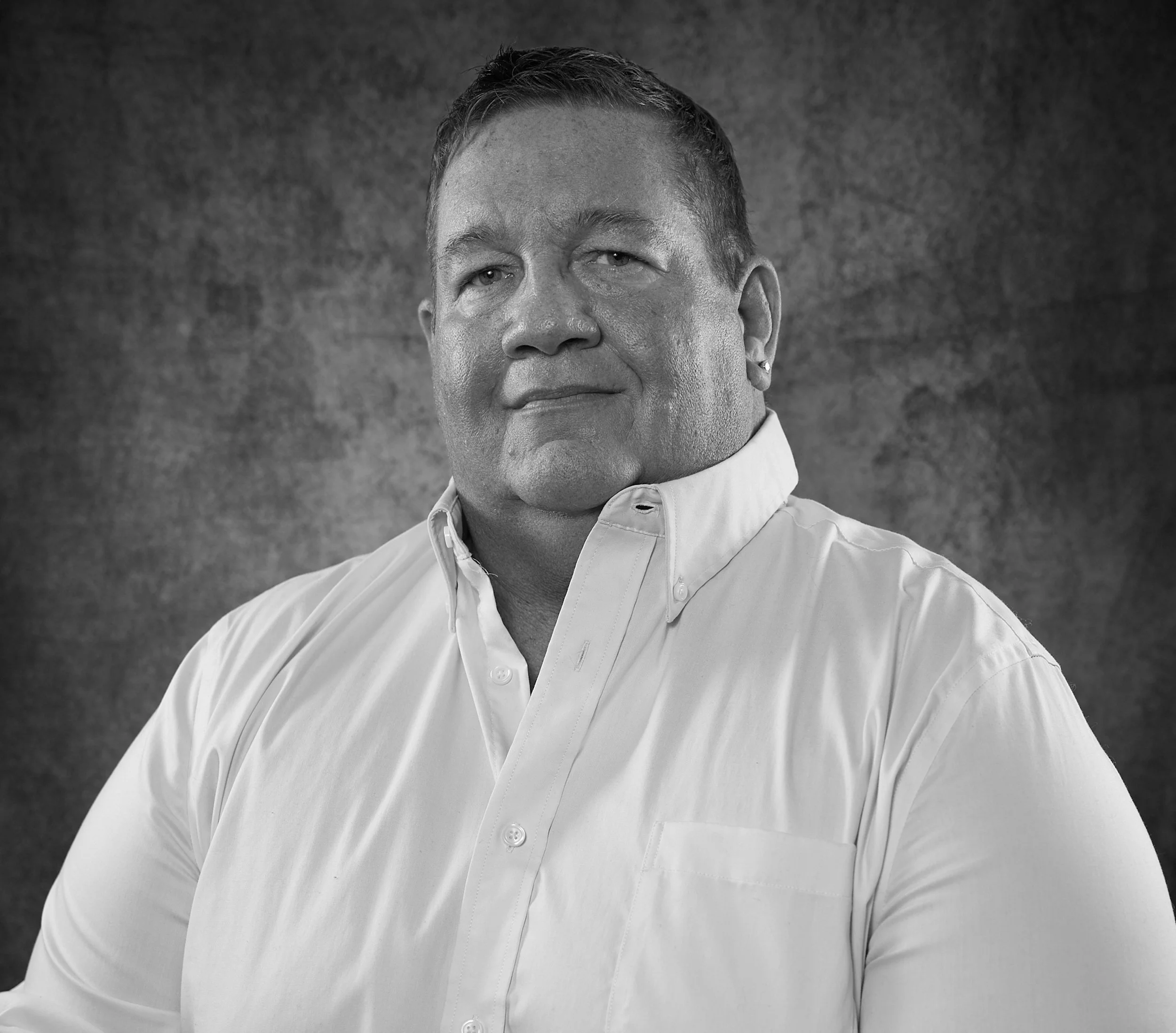 Black and white portrait of a man wearing a white button-up shirt, looking at the camera with a neutral expression, against a dark textured background.