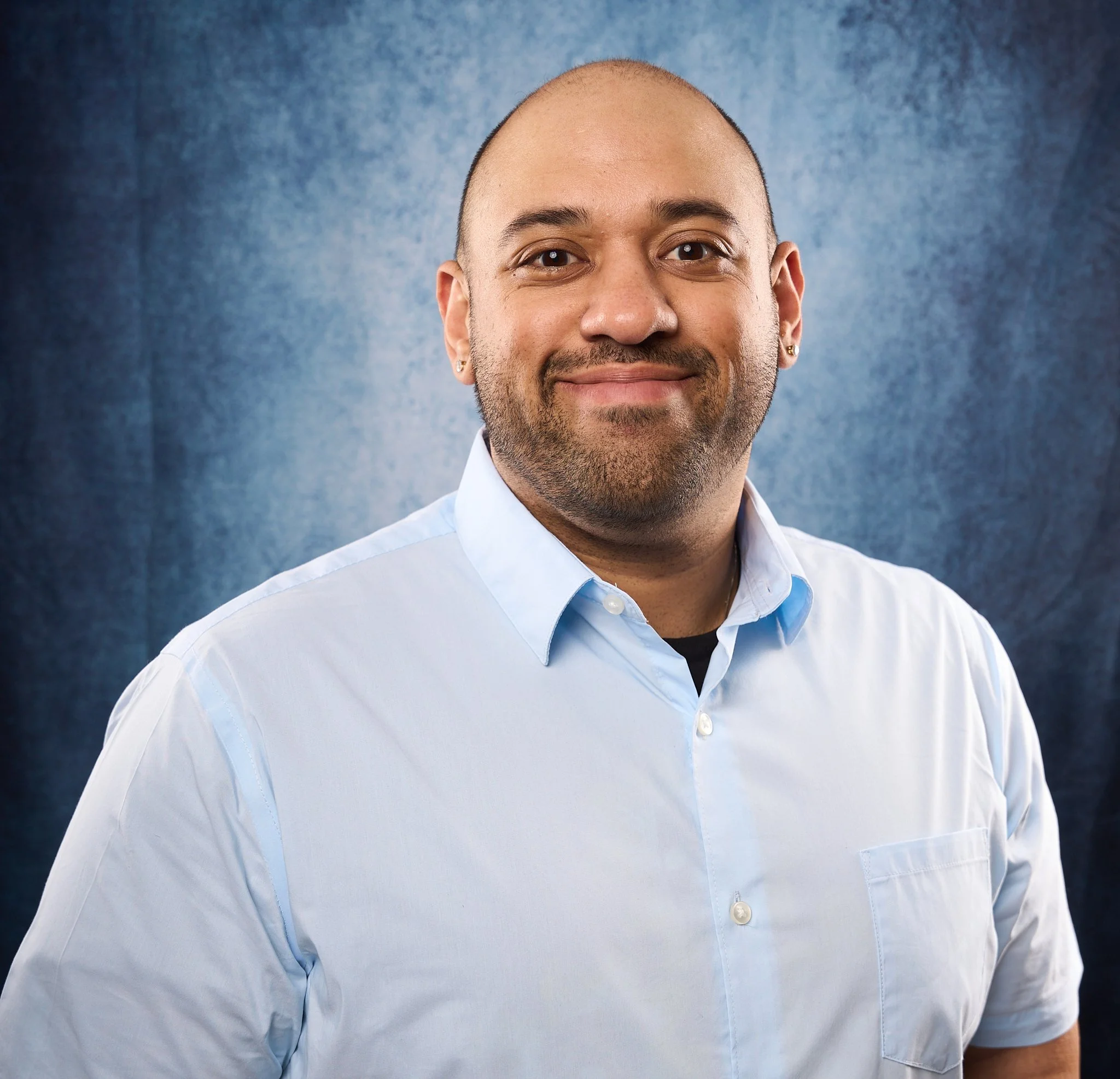 A man with a shaved head, beard, and small earrings wearing a light blue collared shirt standing in front of a blue textured background.