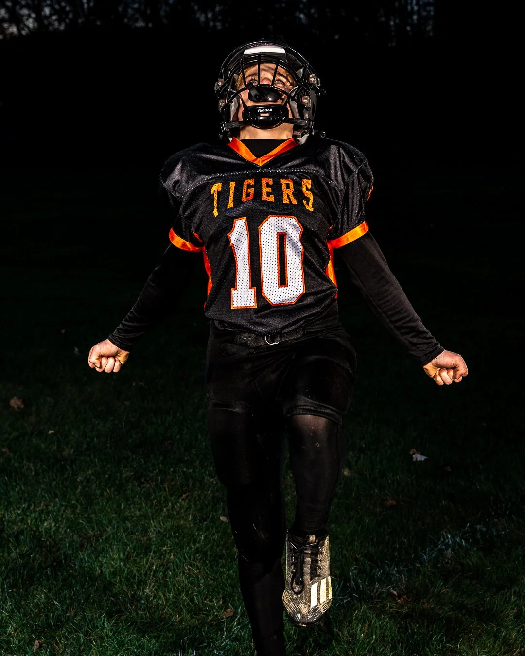 A young football player in black and orange uniform with the number 10, celebrating on the field at night.